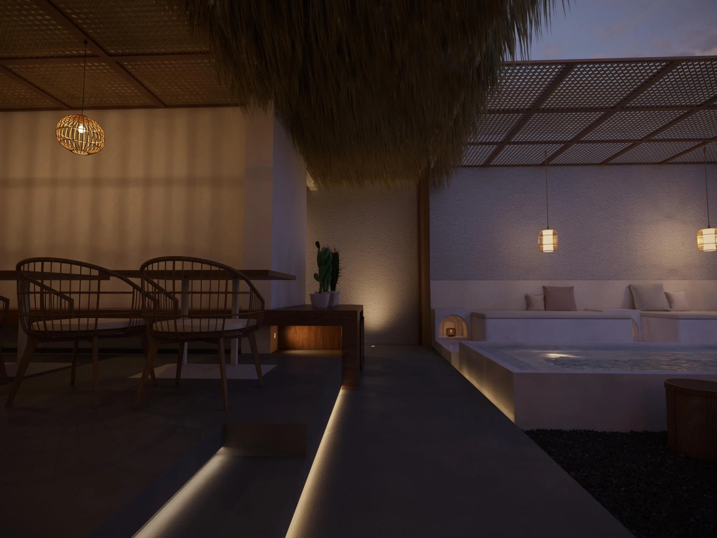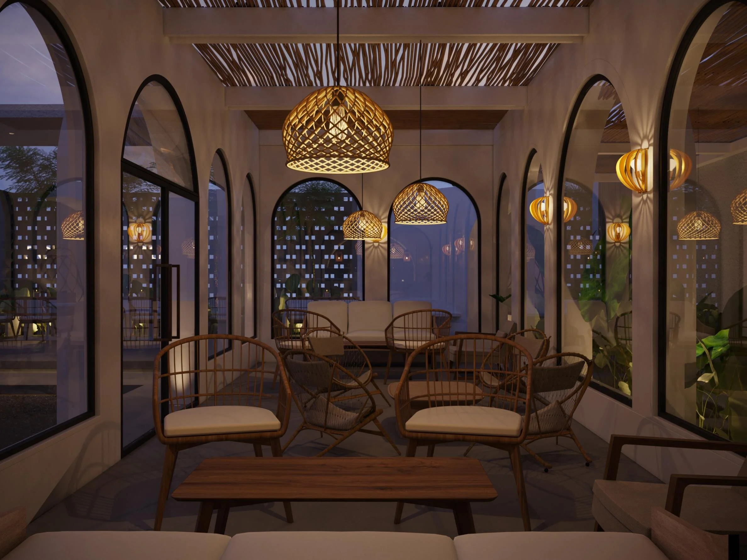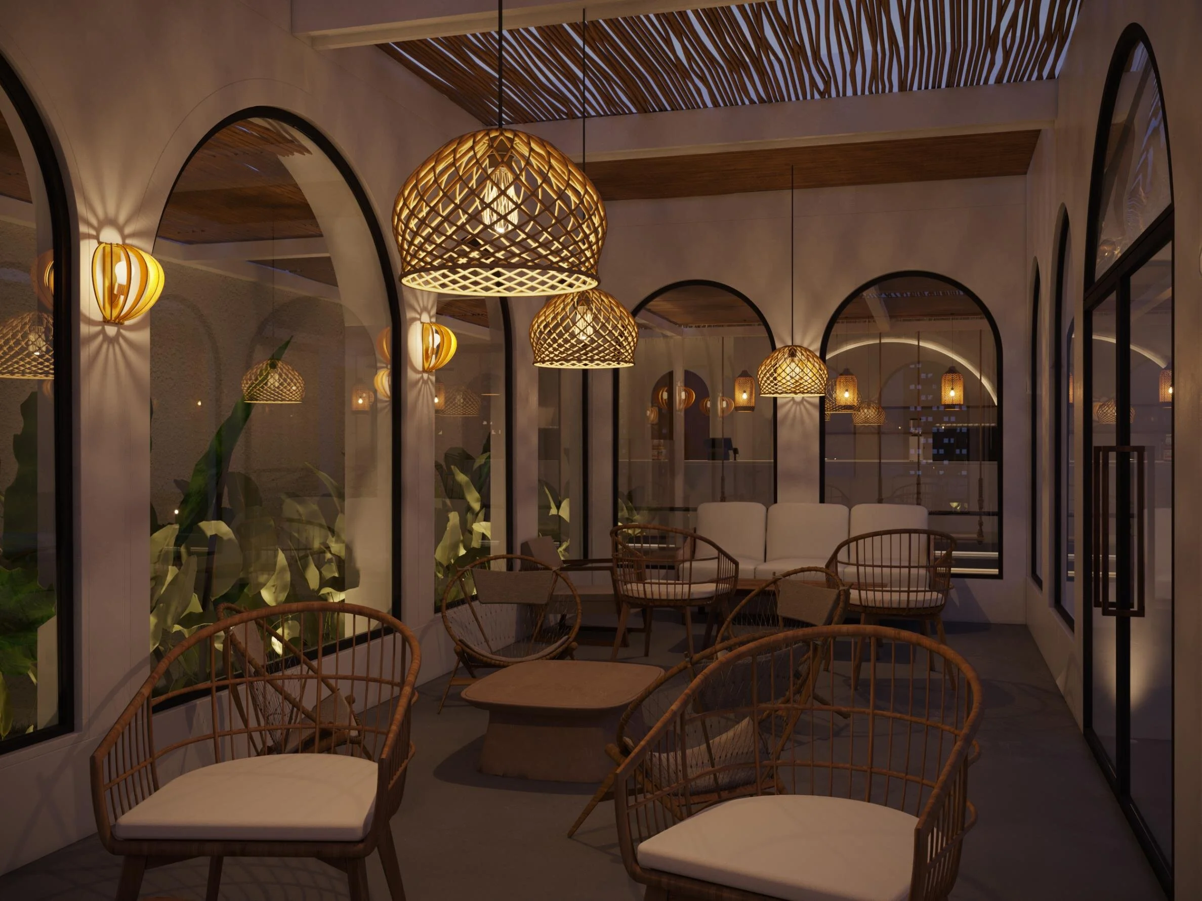 One of a subtle approach when creating an open space in a tropical environment is by juxtaposing natural elements with simple architectural shapes. The arches define a welcoming look as the plantation & water embrace the calm ambience.