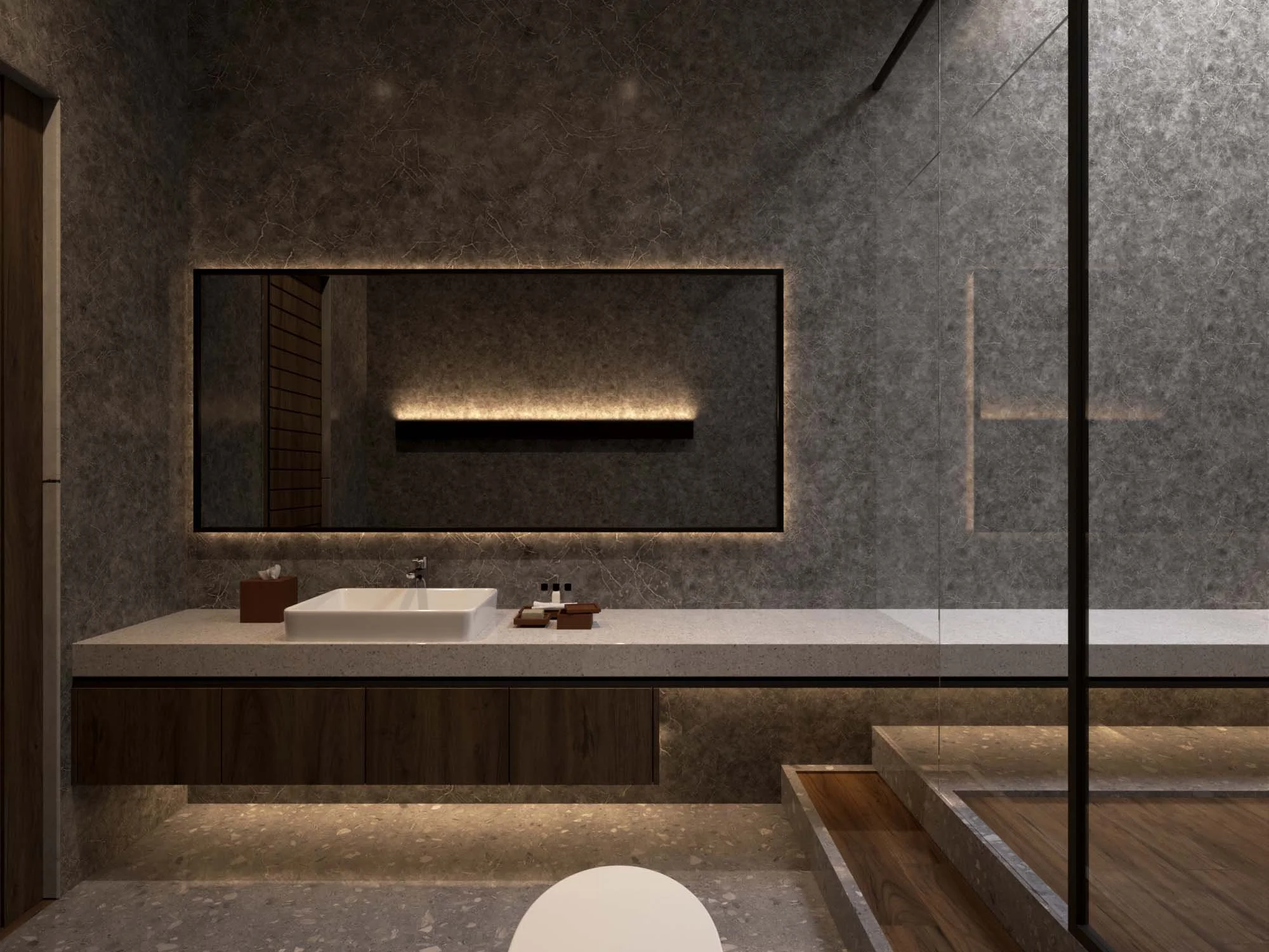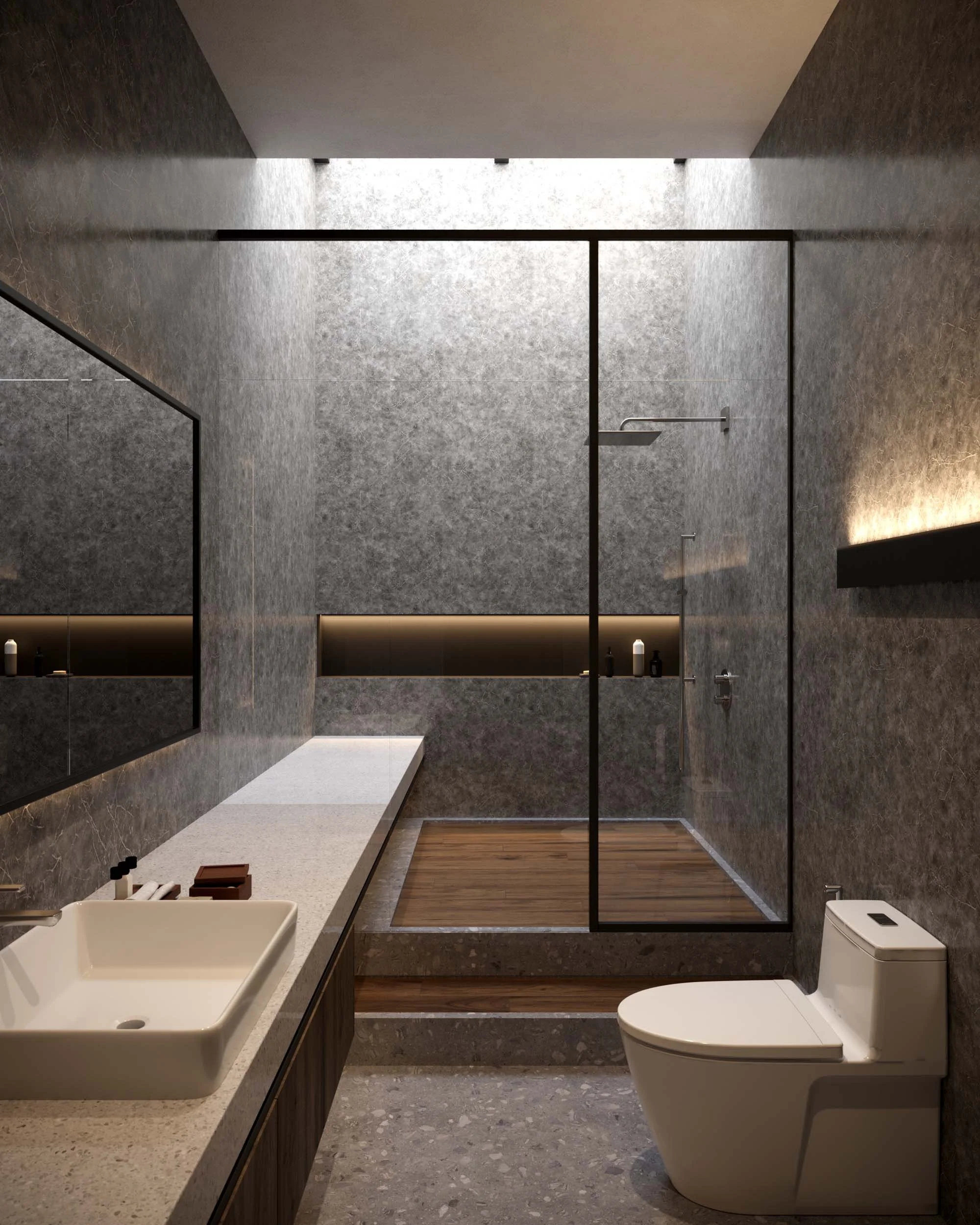 Sometimes, the most interesting place to waste time is in the bathroom. In this limited space, we want to explore this area with the combination of natural stone and heat-treated solid wood. We intend to make a linear shape to achieve spacious illusion, by designing the wash basin countertop float and penetrate the glass inside the shower area, which can also be used as a seating.